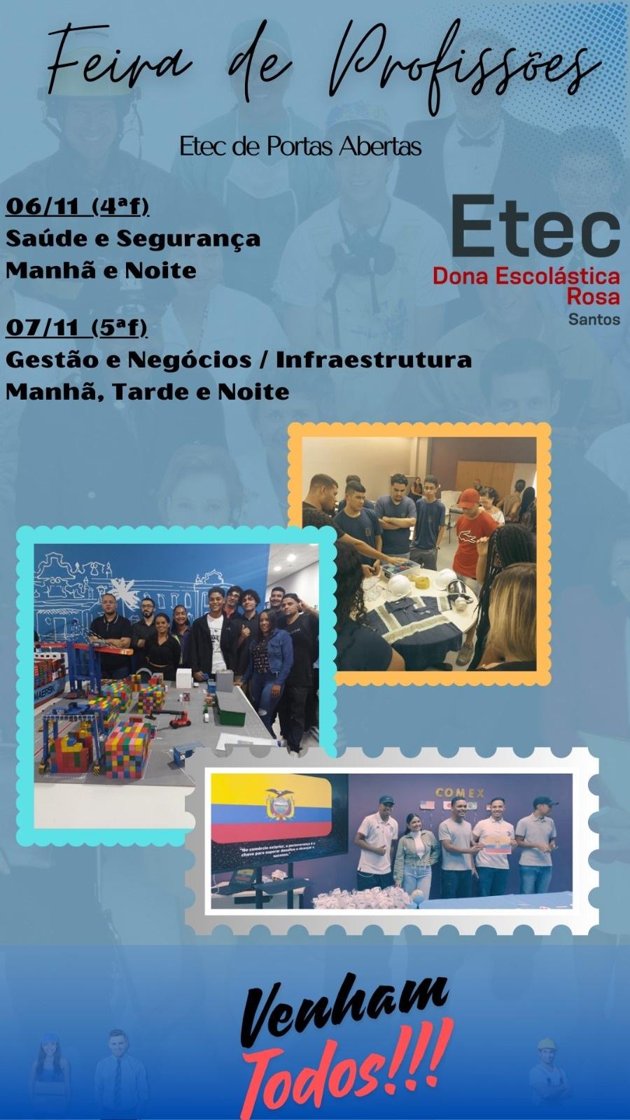 Participe da Feira de Profissões da ETEC Dona Escolástica Rosa. Confira a programação: