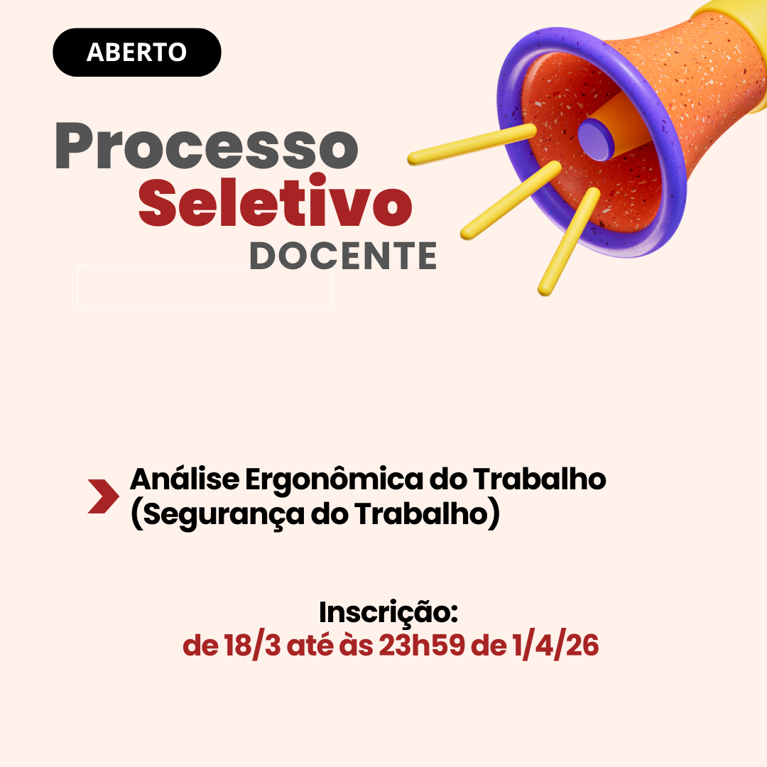 Estão abertas inscrições para Processo Seletivo Simplificado para o componente curricular de Análise Ergonômica do Trabalho, do curso de Técnico em Segurança do Trabalho.